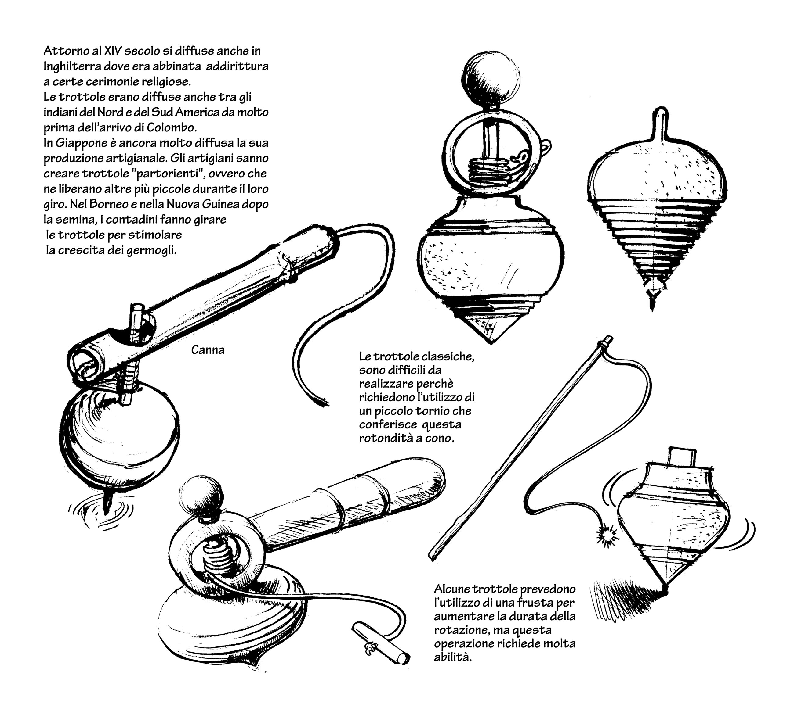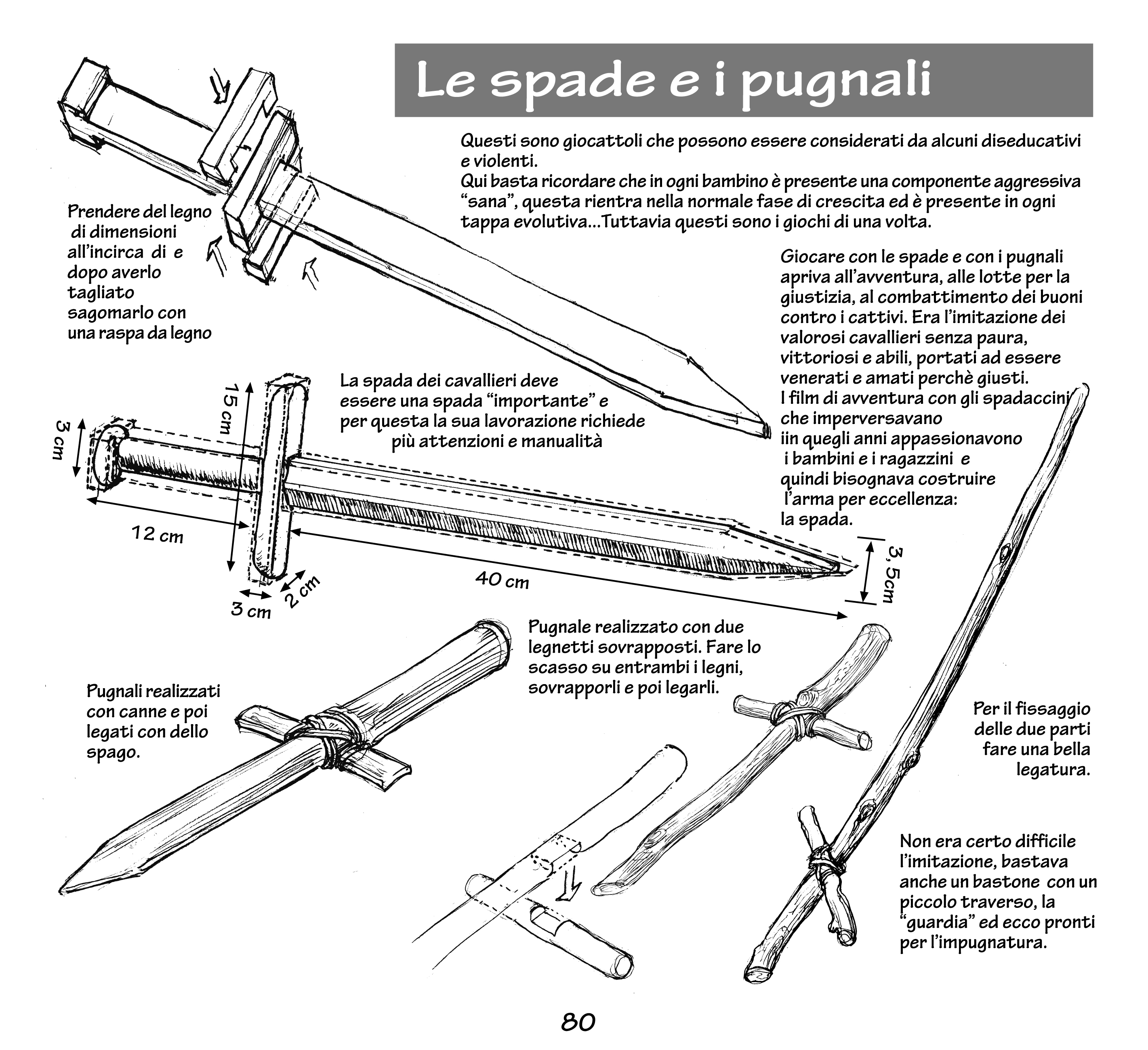 Il libro insegna anche a costruire la lippa, il frullino, la trottola, il monopattino, un aquilone, un carrarmato con un rocchetto e persino una cerbottana, accompagnando ogni creazione con storie e aneddoti.