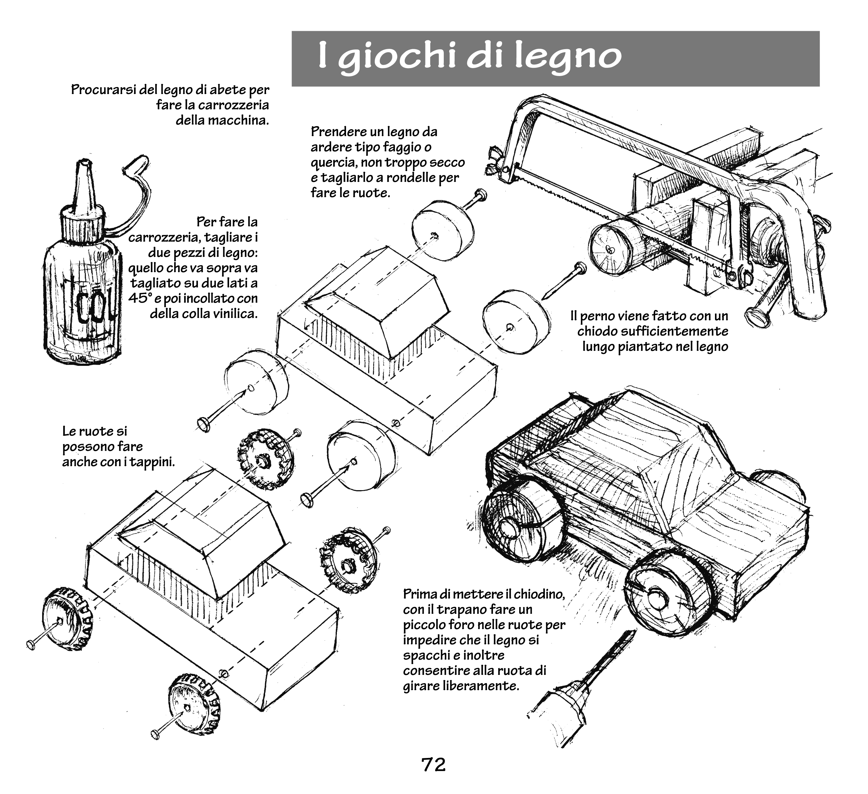 Tra le pagine prendono vita bambole di pezza fatte con fazzoletti o foglie di granoturco, trenini di legno, aerei di carta o a elastico, trampoli ricavati da bidoni, piccoli animali in movimento, archi, frecce, fischietti, trombette, carriolini e scale dei pompieri.